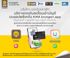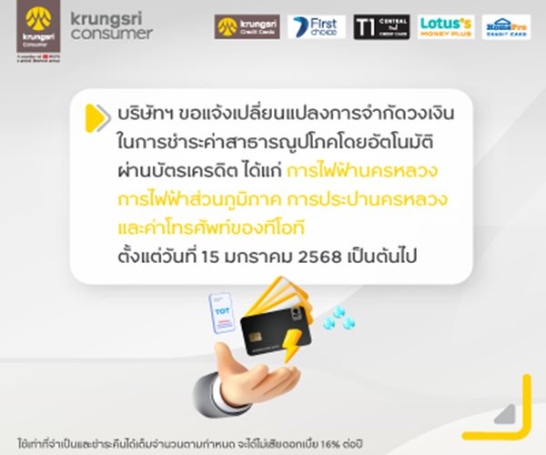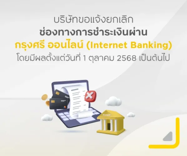 บริษัทขอแจ้งยกเลิกช่องทางการชำระเงินผ่านกรุงศรี ออนไลน์ (Internet Banking) โดยมีผลตั้งแต่วันที่ 1 ตุลาคม 2568 เป็นต้นไป ทั้งนี้ท่านยังคงสามารถชำระเงินผ่านช่องทางอื่นๆ ของธนาคารกรุงศรีได้ตามปกติ หรือสอบถามรายละเอียดเพิ่มเติมได้ที่ศูนย์บริการบัตร หรือศึกษารายละเอียดได้ที่ตารางแสดงอัตราดอกเบี้ยและค่าธรรมเนียม >> คลิก