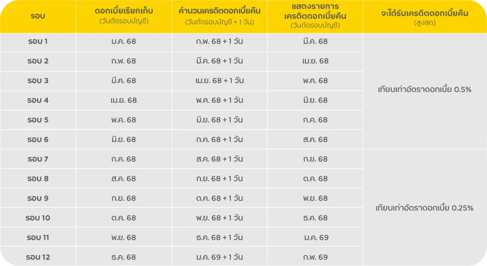 ตอบ : สำหรับลูกค้าบัตรเครดิตที่ชำระหนี้ขั้นต่ำตามยอดที่แสดงในใบแจ้งยอดบัญชี ระหว่างเดือนมกราคม 2568 ถึง ธันวาคม 2568 ทั้งนี้จะมีผลกับรายการที่เกิดจากการรูดซื้อสินค้าเต็มจำนวนเท่านั้น ซึ่งจะไม่รวมรายการผ่อนชำระแบบรายเดือน, การกดเงินสดแบบผ่อนชำระขั้นต่ำ และ การกดเงินสดแบบผ่อนจ่ายรายเดือน