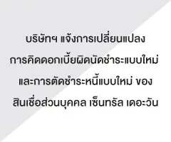 บริษัทไม่มีนโยบายรับชำระเงินผ่านช่องทางบัญชีส่วนบุคคลหรือผ่านลิงก์รับชำระเงินใดๆ กรณีที่ท่านได้รับการติดต่อแจ้งให้ชำระยอดหนี้ค้างบัตรเครดิตหรือสินเชื่อ ขอให้ท่านสอบถามข้อมูลให้แน่ชัดว่าเป็นบัญชีของตนเองจริง