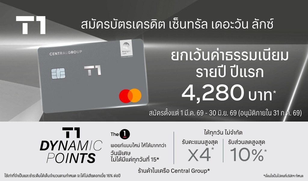 *เงื่อนไขรายการส่งเสริมการขาย (1) ร้านค้าในเครือเซ็นทรัล กรุ๊ป ประกอบด้วย ห้างสรรพสินค้าเซ็นทรัล, ห้างสรรพสินค้าโรบินสัน, ศูนย์การค้าเซ็นทรัล เอ็มบาสซี(เฉพาะร้านค้าที่ร่วมรายการ), ท็อปส์, มัทสึคิโยะ, ซูเปอร์สปอร์ตและร้านค้าในเครือCRC Sports, ไทวัสดุ, บีเอ็นบี โฮม, ออโต้วัน, โก! ว้าว, โก!โฮเทล, เพาเวอร์บาย, ออฟฟิศเมท, บีทูเอส, มูจิ, มาร์คแอนด์สเปนเซอร์, ลอฟท์เตอร์, อีทไทย, Good Goods, ร้านค้าในเครือ เซ็นทรัล มาร์เก็ตติ้ง กรุ๊ป, ร้านอาหารในเครือ เซ็นทรัล เรสตอรองส์กรุ๊ป, โรงแรมและรีสอร์ทในเครือ เซ็นทารา, ศูนย์การค้าเซ็นทรัล (เฉพาะร้านค้าที่ร่วมรายการ), COMMA AND, PLAYHOUSE, HAGCRAFT (2) รับคะแนนเดอะวันสูงสุด 4 คะแนน เมื่อใช้จ่ายผ่านบัตรเครดิต เซ็นทรัล เดอะวัน ลักซ์ ทุกๆ 25 บาท ต่อเซลส์สลิป • รับคะแนนเดอะวันสูงสุด 3 คะแนน เมื่อใช้จ่ายผ่านบัตรเครดิต เซ็นทรัล เดอะวัน เรดซ์ ทุกๆ 25 บาท ต่อเซลส์สลิป (3) บัตรเครดิต เซ็นทรัล เดอะวัน ลักซ์ รับส่วนลดตามเงื่อนไขสูงสุด 10% สำหรับสินค้าราคาปกติที่ร่วมรายการเท่านั้น • บัตรเครดิต เซ็นทรัล เดอะวัน เรดซ์ รับส่วนลดตามเงื่อนไขสูงสุด 5% สำหรับสินค้าราคาปกติที่ร่วมรายการเท่านั้น (4) Go!Wholesale รับคะแนนเดอะวัน 10 คะแนน เมื่อใช้จ่ายผ่านบัตรเครดิต เซ็นทรัล เดอะวัน ทุกยอดใช้จ่าย 100 บาท ต่อเซลส์สลิป • กรุณาตรวจสอบข้อกำหนดและเงื่อนไขในสื่อโฆษณาอื่นๆ ของบริษัทฯ หรือที่ www.centralthe1card.com