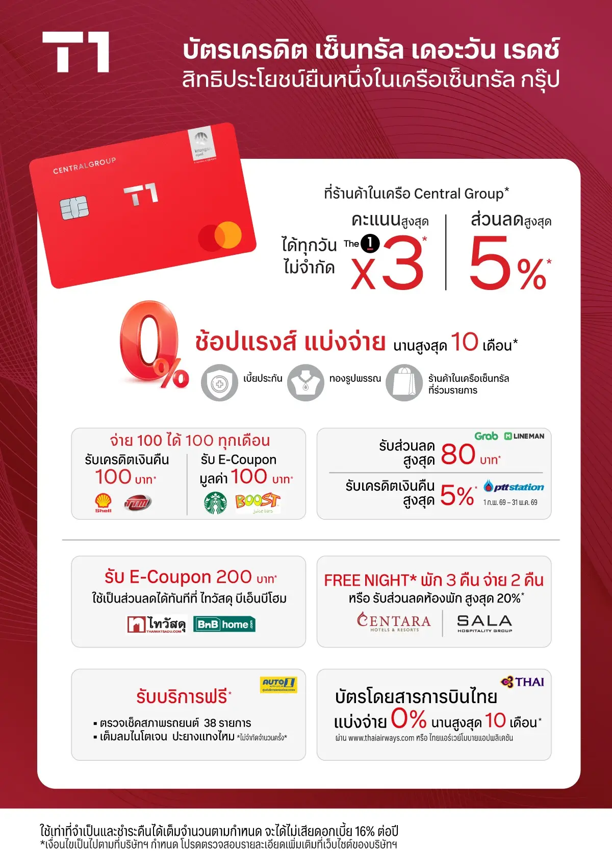 เงื่อนไขทั่วไป: • สิทธิประโยชน์ตามรายการดังกล่าวไม่สามารถเปลี่ยน / แลก / ทอนเป็นเงินสด หรือโอนให้แก่ผู้อื่นได้ • บริษัทฯ จะมอบสิทธิประโยชน์ตามรายการนี้ให้แก่สมาชิกบัตรที่คงสภาพสมาชิกและมีประวัติการชำระที่ดีจนถึงวันที่บริษัทฯ มอบสิทธิประโยชน์ • บริษัทฯ จะเรียกคืนสิทธิประโยชน์หรือเรียกเก็บเงินจากบัญชีบัตรเครดิตของสมาชิกบัตรตามมูลค่าของสิทธิประโยชน์ที่สมาชิกบัตรได้รับในกรณีที่มีการให้สิทธิประโยชน์ผิดพลาดหรือคลาดเคลื่อน หรือกรณีที่สมาชิกบัตรยกเลิก/ปฏิเสธรายการหรือการชำระเงินในภายหลัง • กรณีสมาชิกบัตรไม่ได้รับสิทธิประโยชน์ หรือได้รับแต่ไม่ถูกต้อง โปรดติดต่อศูนย์บริการบัตรภายใน 90 วัน นับจากวันสิ้นสุดรายการ มิเช่นนั้นจะถือว่าสมาชิกบัตรยอมรับว่าการดำเนินการของบริษัทฯ ถูกต้องแล้ว • บริษัทฯ ถือตามข้อมูลที่ปรากฏในระบบของบริษัทฯ เป็นสำคัญ กรุณาเก็บหลักฐานการเข้าร่วมรายการและเซลล์สลิปไว้ตรวจสอบกรณีจำเป็น • เงื่อนไขเป็นไปตามที่บริษัทฯ/ร้านค้า/ผู้ให้บริการ กำหนด • บริษัทฯ ไม่มีส่วนเกี่ยวข้องกับสินค้า/บริการ หากมีข้อสงสัยหรือข้อขัดข้องประการใด โปรดติดต่อผู้จำหน่าย/ผู้ให้บริการโดยตรง • ให้บริการบัตรเครดิตโดย บริษัท เจเนอรัล คาร์ด เซอร์วิสเซส จำกัด