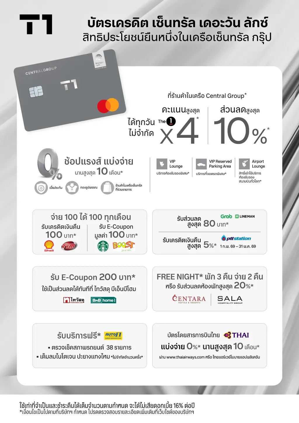เงื่อนไขทั่วไป: • สิทธิประโยชน์ตามรายการดังกล่าวไม่สามารถเปลี่ยน / แลก / ทอนเป็นเงินสด หรือโอนให้แก่ผู้อื่นได้ • บริษัทฯ จะมอบสิทธิประโยชน์ตามรายการนี้ให้แก่สมาชิกบัตรที่คงสภาพสมาชิกและมีประวัติการชำระที่ดีจนถึงวันที่บริษัทฯ มอบสิทธิประโยชน์ • บริษัทฯ จะเรียกคืนสิทธิประโยชน์หรือเรียกเก็บเงินจากบัญชีบัตรเครดิตของสมาชิกบัตรตามมูลค่าของสิทธิประโยชน์ที่สมาชิกบัตรได้รับในกรณีที่มีการให้สิทธิประโยชน์ผิดพลาดหรือคลาดเคลื่อน หรือกรณีที่สมาชิกบัตรยกเลิก/ปฏิเสธรายการหรือการชำระเงินในภายหลัง • กรณีสมาชิกบัตรไม่ได้รับสิทธิประโยชน์ หรือได้รับแต่ไม่ถูกต้อง โปรดติดต่อศูนย์บริการบัตรภายใน 90 วัน นับจากวันสิ้นสุดรายการ มิเช่นนั้นจะถือว่าสมาชิกบัตรยอมรับว่าการดำเนินการของบริษัทฯ ถูกต้องแล้ว • บริษัทฯ ถือตามข้อมูลที่ปรากฏในระบบของบริษัทฯ เป็นสำคัญ กรุณาเก็บหลักฐานการเข้าร่วมรายการและเซลล์สลิปไว้ตรวจสอบกรณีจำเป็น • เงื่อนไขเป็นไปตามที่บริษัทฯ/ร้านค้า/ผู้ให้บริการ กำหนด • บริษัทฯ ไม่มีส่วนเกี่ยวข้องกับสินค้า/บริการ หากมีข้อสงสัยหรือข้อขัดข้องประการใด โปรดติดต่อผู้จำหน่าย/ผู้ให้บริการโดยตรง • ให้บริการบัตรเครดิตโดย บริษัท เจเนอรัล คาร์ด เซอร์วิสเซส จำกัด