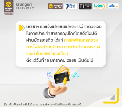 บริษัทขอแจ้งยกเลิกช่องทางการชำระเงินผ่านกรุงศรี ออนไลน์ (Internet Banking) โดยมีผลตั้งแต่วันที่ 1 ตุลาคม 2568 เป็นต้นไป ทั้งนี้ท่านยังคงสามารถชำระเงินผ่านช่องทางอื่นๆ ของธนาคารกรุงศรีได้ตามปกติ หรือสอบถามรายละเอียดเพิ่มเติมได้ที่ศูนย์บริการบัตร หรือศึกษารายละเอียดได้ที่ตารางแสดงอัตราดอกเบี้ยและค่าธรรมเนียม >> คลิก