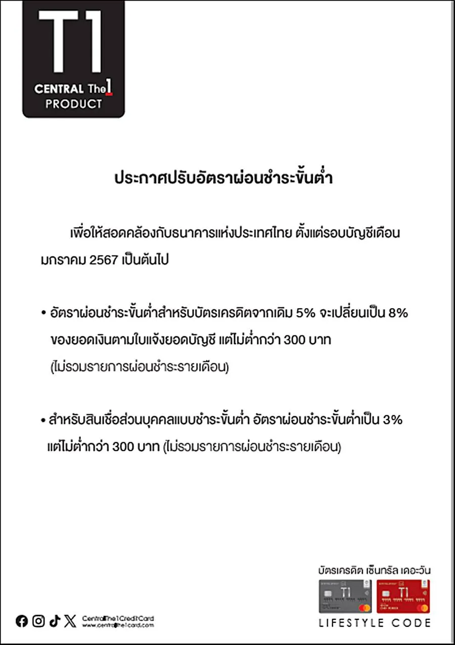 ปรับลดอัตราผ่อนชำระขั้นต่ำโดยอัตโนมัติ ลดจาก 5% เป็น 3% (เฉพาะสินเชื่อเงินสดแบบชำระขั้นต่ำ) มีผลตั้งแต่วันสรุปยอดบัญชี 1 ม.ค. 65 - 31 ธ.ค. 66