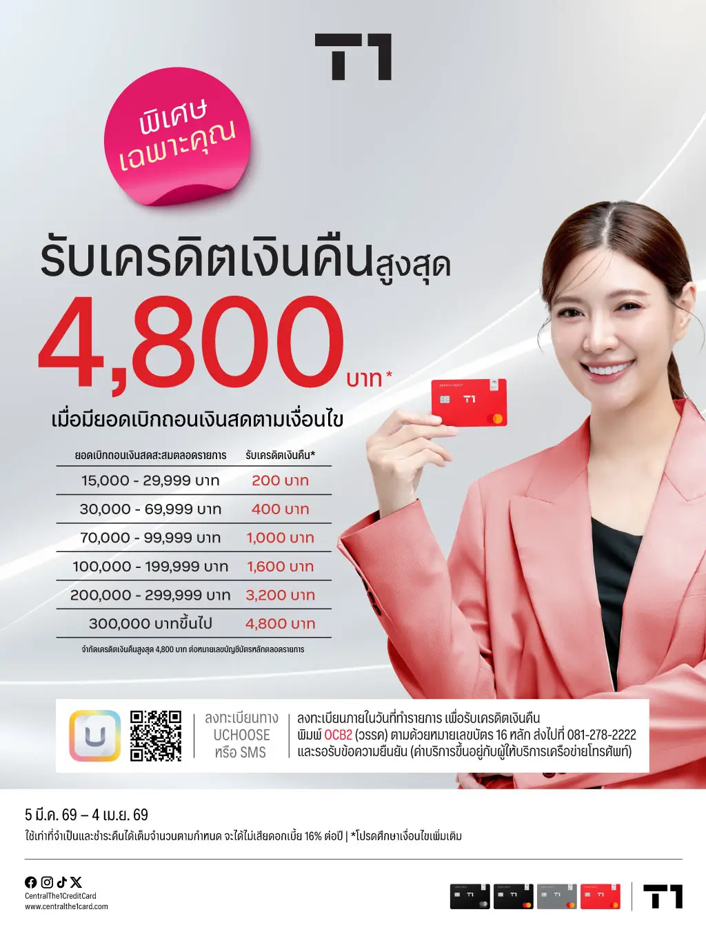 • รับเครดิตเงินคืน เมื่อมียอดเบิกถอนเงินสดสะสมครบตามเงื่อนไขที่กำหนด ระหว่างวันที่ 5 มี.ค. 2569 - 4 เม.ย. 2569 และต้องเป็นยอดเบิกเงินสดด้วยบัตรเครดิตเซ็นทรัล เดอะวัน (วงเงินของบัตรเครดิตตสำหรับการเบิกถอนเงินสดล่วงหน้า) ผ่านแอปพลิเคชัน UCHOOSE จากตู้เอทีเอ็ม หรือเบิกผ่านเคาน์เตอร์ธนาคาร