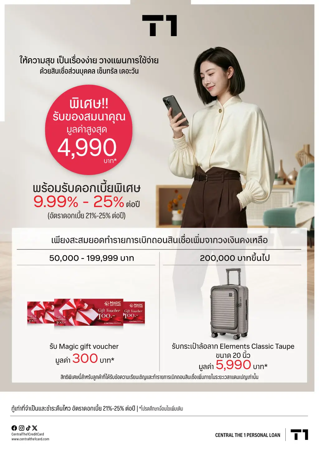 • ยอดสะสมสินเชื่อเงินสดโอนเข้าบัญชี 200,000 บาทขึ้นไป รับกระเป๋าล้อลาก ELEMENTS CLASSIC TAUPE ขนาด 20 นิ้ว มูลค่า 5,990 บาท จำนวน 1 ใบ