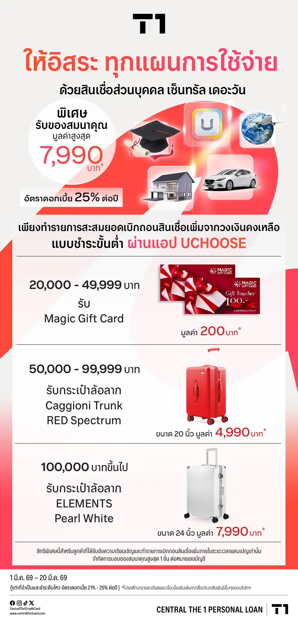 • ยอดสะสมสินเชื่อเงินสดโอนเข้าบัญชี 100,000 บาทขึ้นไป รับกระเป๋าล้อลาก ELEMENTS รุ่น Pearl White ขนาด 24 นิ้ว มูลค่า 7,990 บาท จำนวน 1 ใบ