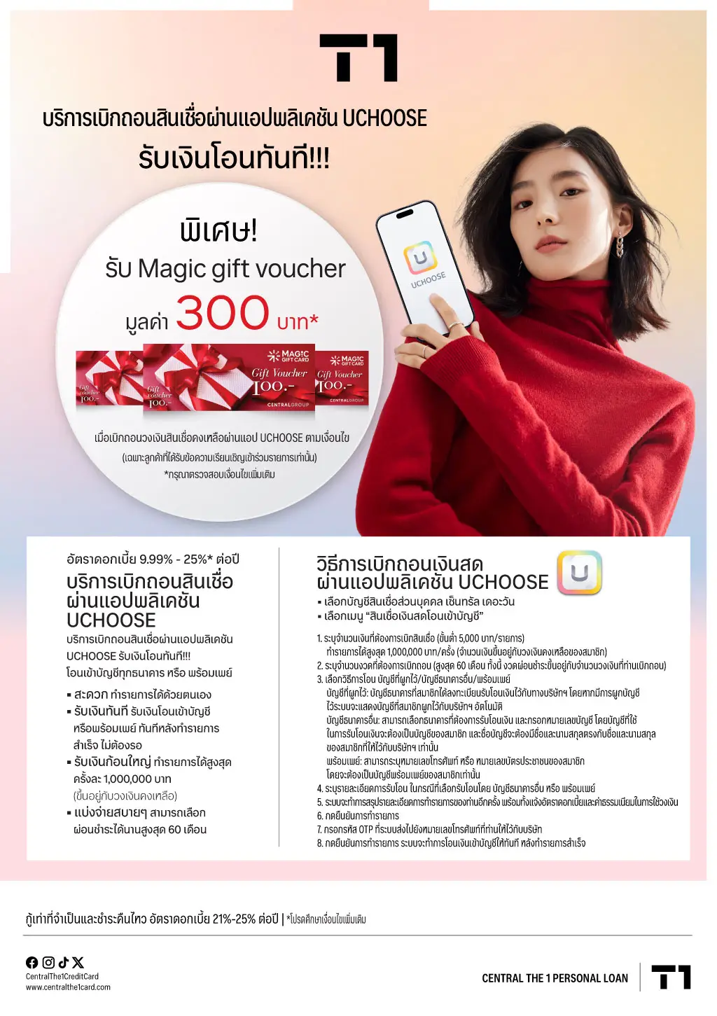• สมาชิกบัญชีสินเชื่อส่วนบุคคล เซ็นทรัล เดอะวัน ที่ได้รับข้อความเรียนเชิญเข้าร่วมรายการส่งเสริมการขายนี้และมีรายการเบิกถอนเงินสดจากบัญชีสินเชื่อส่วนบุคคล เซ็นทรัล เดอะวัน บนแอป UCHOOSE สะสมตั้งแต่ 5,000 บาทขึ้นไป ระหว่างวันที่ 1 มี.ค.69 – 31 มี.ค.69 จะได้รับบัตรกำนัล Magic gift voucher มูลค่า 300 บาท