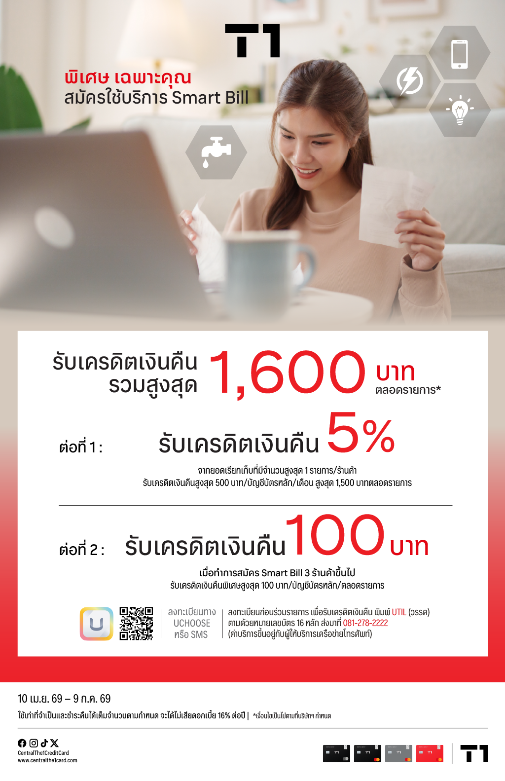 6. สมาชิกบัตรฯ มีสิทธิได้รับเครดิตเงินคืนเมื่อมีการผูกบัตรเครดิตเซ็นทรัล เดอะวัน เพื่อค่าใช้บริการภายใน 9 ก.ค. 69 และมีรายการชำระค่าสาธารณูปโภคหรือค่าบริการที่ร่วมรายการ และมีการหักบัตรเครดิตชำระภายใน 9 ก.ค. 69